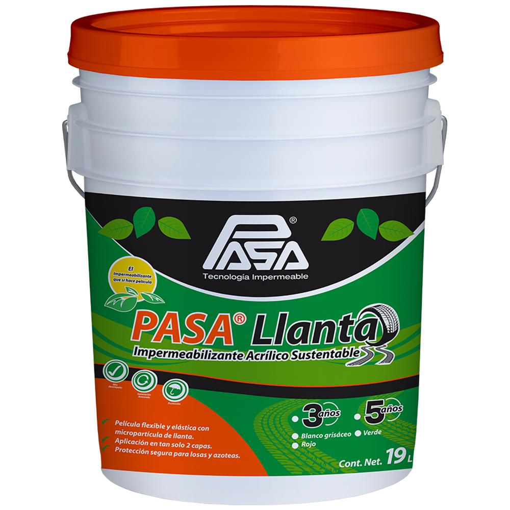 - PASA® Llanta se usa como sistema impermeabilizante profesional para losas de concreto, azoteas de concreto con acabado de ladrillo o tabique, techumbres de asbesto-cemento y techos de lámina metálica, entre otros.